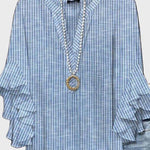 Nora | Silhuet Blå hæver den klassiske stil med rolig, tidsløs elegance. Den blå bund med hvide lodrette striber fremhæver et minimalistisk snit, der taler til det raffinerede i dig. Den delikate volang på ærmerne tilføjer bevægelse og femininitet uden at overdrive. Hver detalje antyder omhyggeligt håndværk og en gennemført finish, som gør toppen til et alsidigt investeringsvalg for garderoben. Designet til at holde formen gennem sæsonerne, mens den afslappede pasform lover komfort hele dagen.
