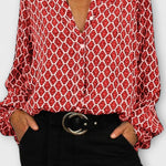 Pernille | V-hals skjorte er et statement i diskret luksus, skabt med omtanke for håndværk og arv. Den lette V-hals giver en ren, elegant silhuet, mens det geometriske mønster tilfører et moderne præg uden at gå på kompromis med tidløse værdier. Den normale pasform sikrer komfort hele dagen, mens det bløde materiale kærtegner huden og bevarer pasformen gennem årene. Med begrænset produktion og en tidløs finish udgør Pernille en investering i kvalitet, der appellerer til samlere af kvalitetsgarderobe. Nappiliste og knapdetaljer fuldender et gennemført og eksklusivt look.