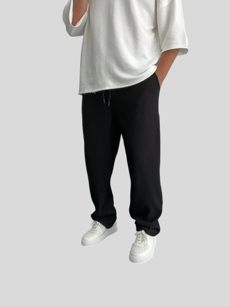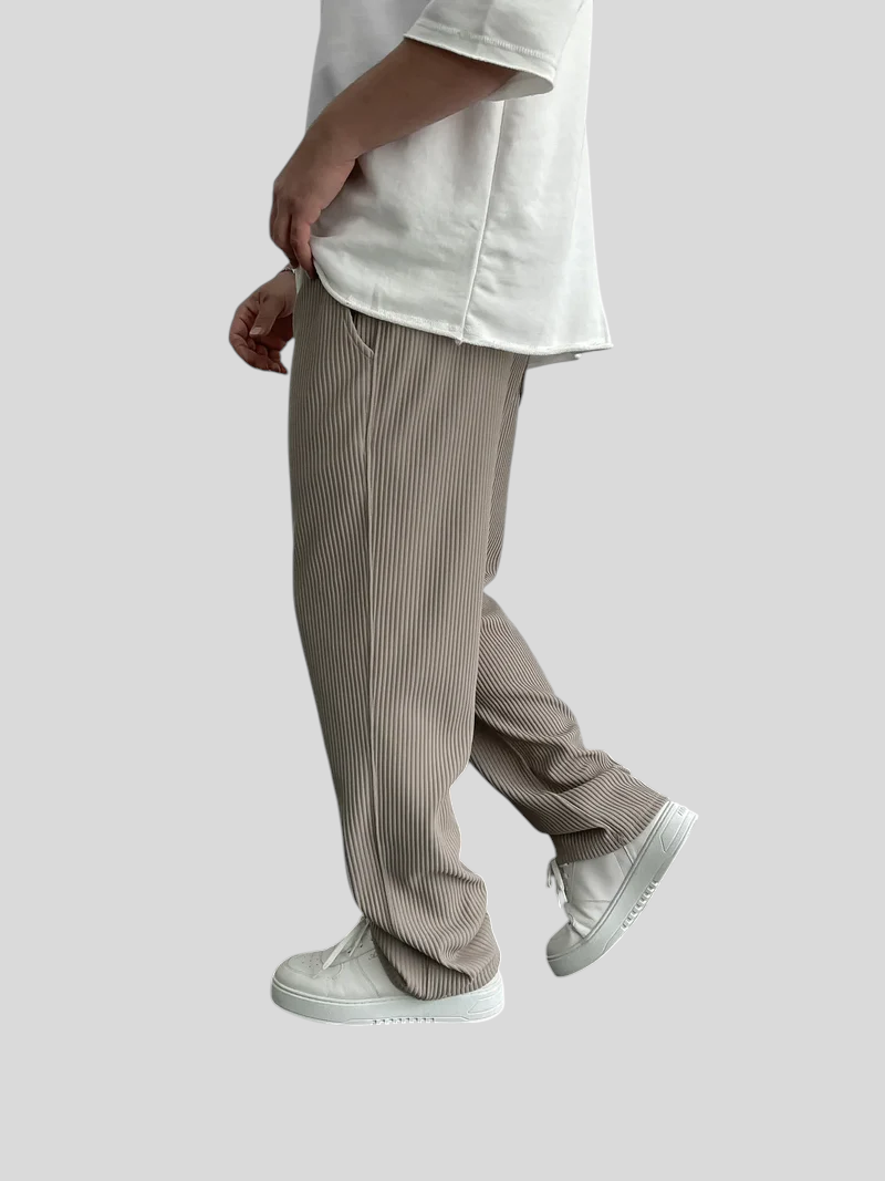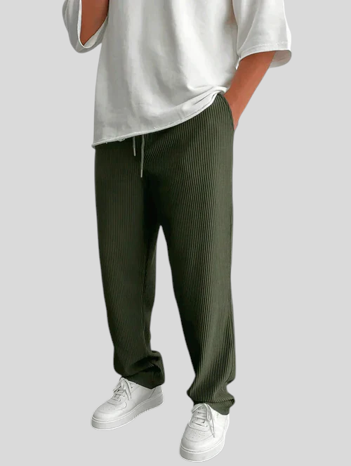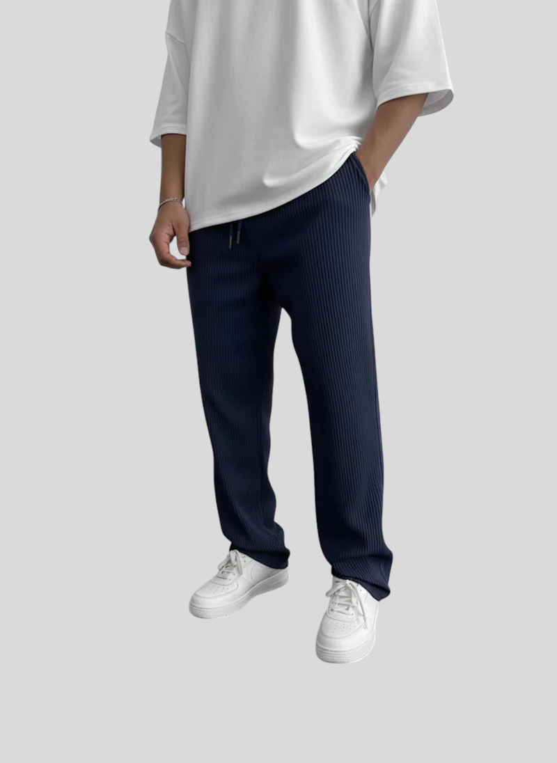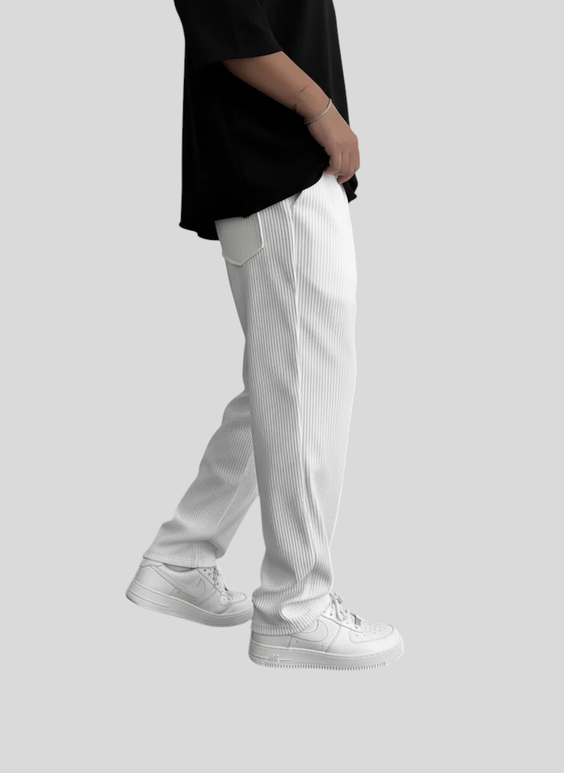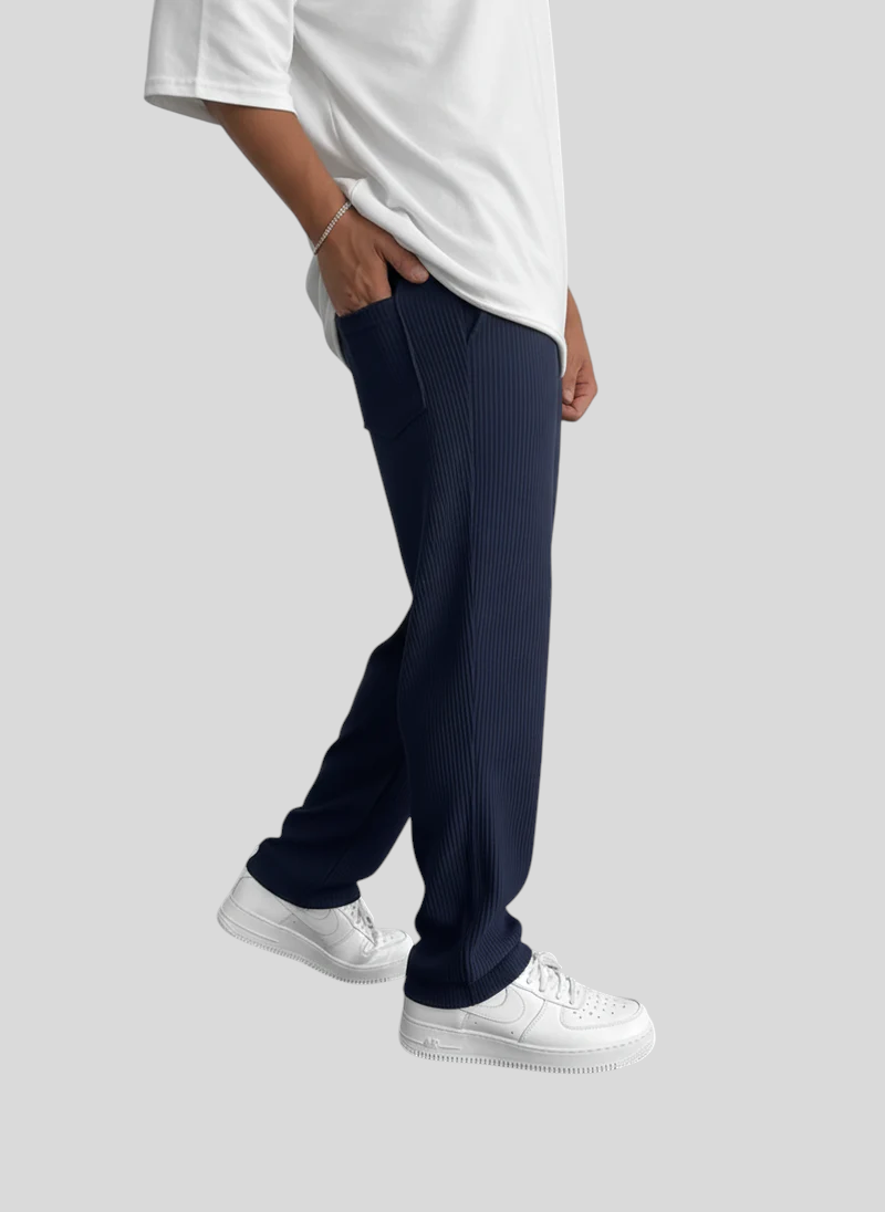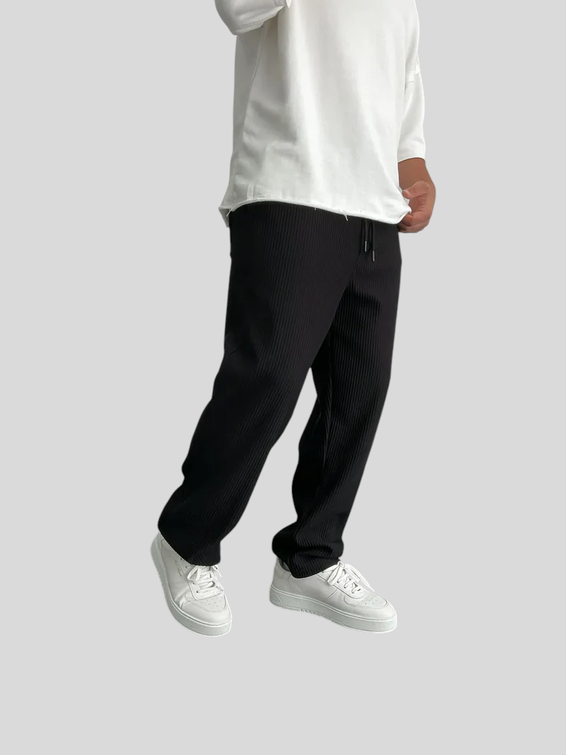 Disse bukser er skabt til mænd, der ønsker et stilrent look kombineret med maksimal komfort. Den afslappede pasform og den diskrete ribstruktur giver et moderne og velafbalanceret udtryk, mens den fleksible talje sikrer bevægelsesfrihed hele dagen. Perfekte til både hverdagsbrug, afslappede outfits og urbane looks med personlighed.