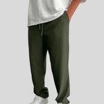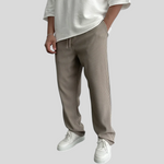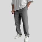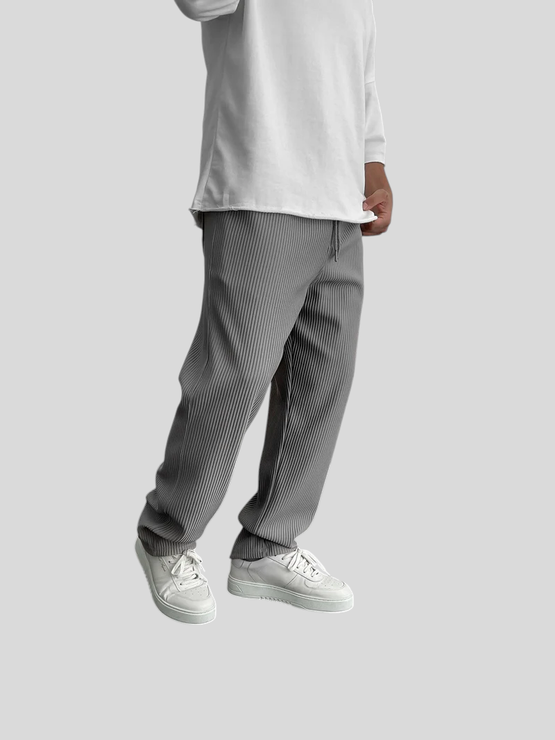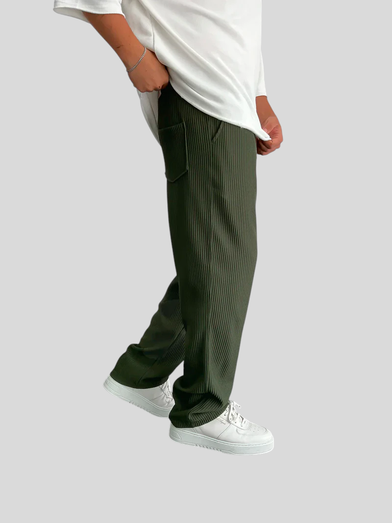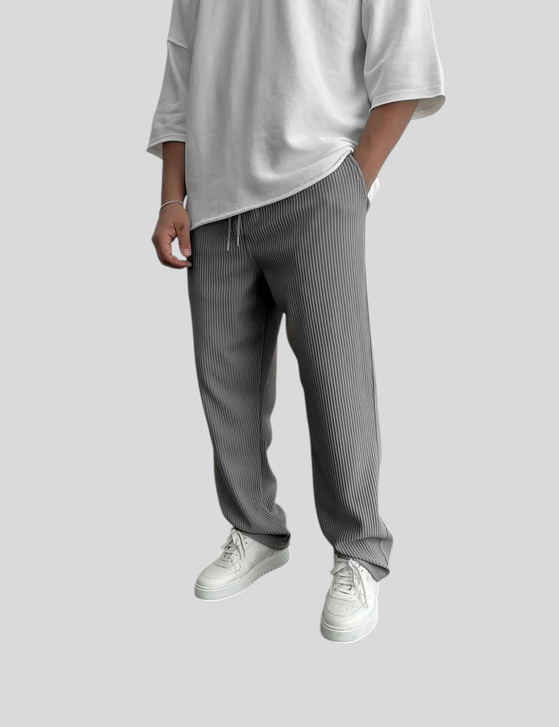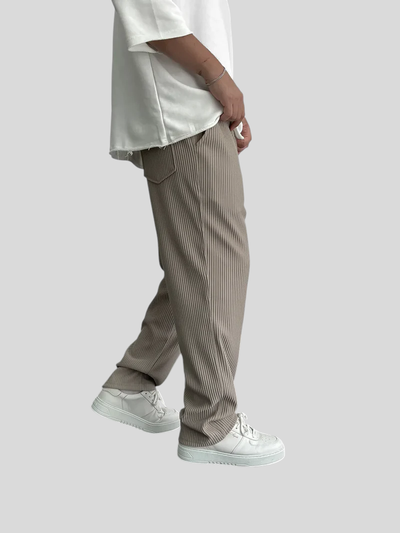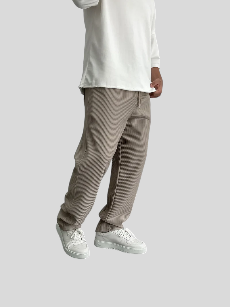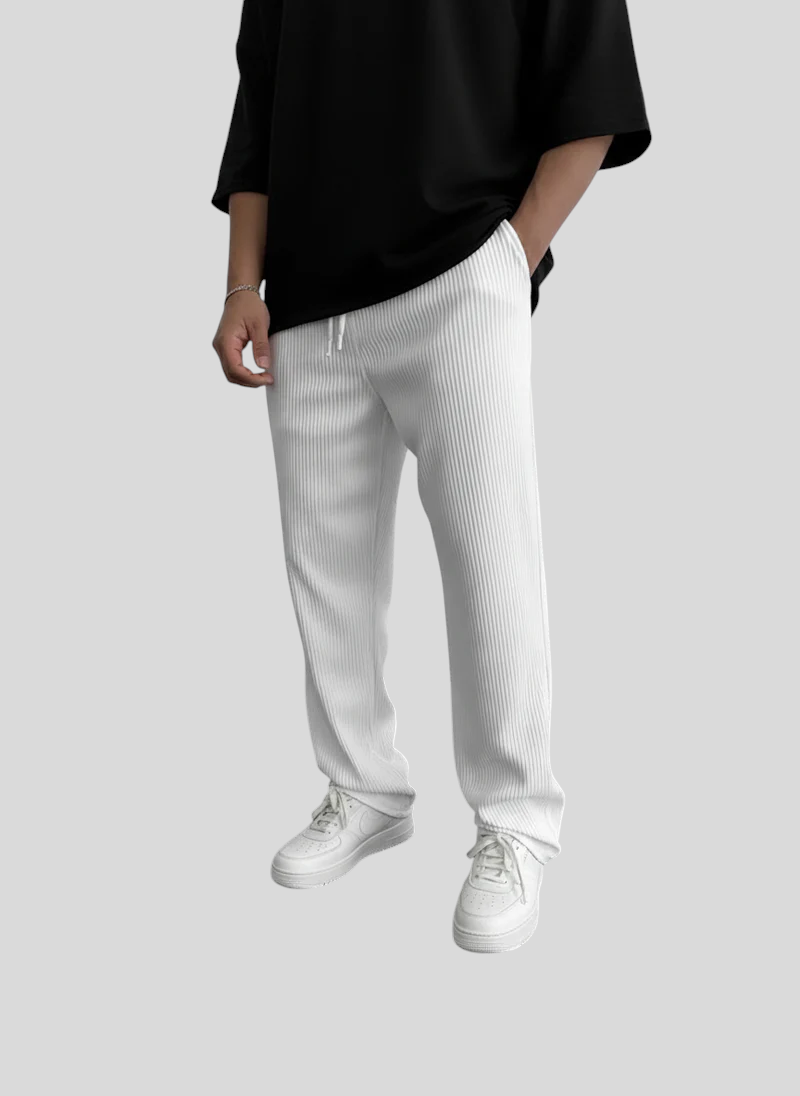 Disse bukser er skabt til mænd, der ønsker et stilrent look kombineret med maksimal komfort. Den afslappede pasform og den diskrete ribstruktur giver et moderne og velafbalanceret udtryk, mens den fleksible talje sikrer bevægelsesfrihed hele dagen. Perfekte til både hverdagsbrug, afslappede outfits og urbane looks med personlighed.
