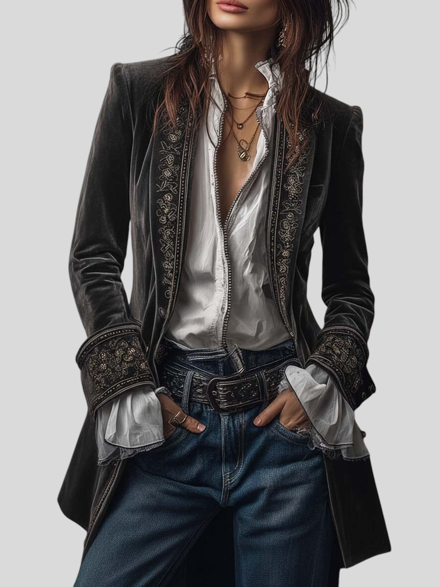 Federica – Vintage Lang Fløjlsjakke Med Broderier