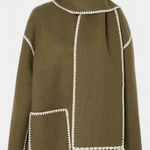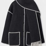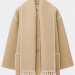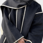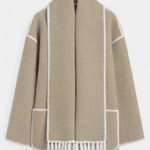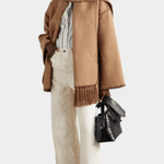 - Integreret halstørklæde – halstørklædet med frynser tilføjer tekstur og ekstra varme uden at tyngde silhuetten.