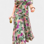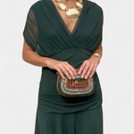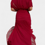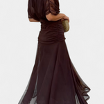 Sofistikeret, feminin og helt igennem betagende – denne lange chiffonkjole med smukke draperinger er skabt til at fremhæve din elegance med et eksklusivt touch. Den off-shoulder udskæring fremhæver skuldre og halsudskæring på en delikat måde, mens draperingerne former kroppen og skaber en harmonisk, raffineret silhuet. Perfekt til bryllupper, fester, ceremonier og særlige aftener, hvor du vil føle dig selvsikker, smuk og uforglemmelig.