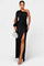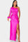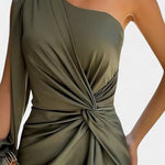 • Designdetaljer – Asymmetrisk en-skulder halsudskæring, formede draperinger og taljebind, der definerer silhuetten.