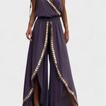 - Signaturdetaljer: krydset halsudskæring og åben ryg, der rammer décolletage og rygparti med elegance.