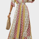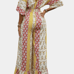 Emma er en bohemisk heldragt, der indpoder tidløs elegance og en arv af håndværk. Den omhyggelige konstruktion vidner om omtanke og kvalitet, mens materialet giver en let, flydende silhuet i bevægelse. Den elegante V-hals fremhæver halslinien, og den elastiske talje sikrer en figursyet pasform uden at gå på kompromis med komforten. Løse, luftige ærmer skaber bevægelse og et sofistikeret fald, der gør Emma alsidig gennem årstiderne. Med sit karakterfulde bohememønster og sans for detaljer står Emma som et kvalitetsvalg i garderoben — en investering, der kan bæres år efter år og bevarer sin form og farve gennem sæsoner. Den velovervejede konstruktion kombinerer komfort med en eksklusiv æstetik, hvilket gør den til en pålidelig investering for den stilbevidste samler, og begrænset antal enheder sikrer eksklusivitet.