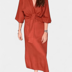 Astrid er en elegant midi-kjole fra Ainhoa™, hvor en dyb V-hals, kimonoærmer og en markant frontknude mødes i en raffineret, tidløs silhuet. Den strukturerede, bløde stofkvalitet sikrer en præcis pasform og en løftende drapering, der fremhæver taljen uden at gå på kompromis med komforten. Hver detalje vidner om håndværkets omhu og materialernes nøje udvælgelse, hvilket skaber et stykke tøj, der føles som en arv snarere end en trend. Med begrænset tilgængelighed fremstår Astrid som en investeringskjole, der kombinerer tidløs elegance med samlerappel og en bæredygtig værdi i garderoben.