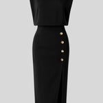 - Signaturdetaljer og rund halsudskæring: Ensfarvet design med dekorative knapper som signaturdetalje.