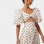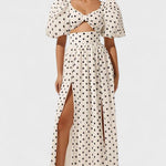• Design og detaljer: Klassisk polkadot-mønster, pufærmer og frontslids skaber en sofistikeret balance mellem stil og funktion.