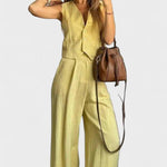 Katrine | Sæt udstråler tidsløs, moderne elegance og raffineret håndværk i en velafstemt silhuet. Dette todelte Sorrento-sæt består af en ærmeløs vest og brede bukser, der sammen skaber en ren, struktureret form. Tilgængeligt i Sunlit Yellow og Soft Apricot, forener Sorrento livlige farver med åndbart, rynkefrit stof, der lover komfort og lang levetid. Med begrænset tilgængelighed er sættet en investering i varig luksus og en tidløs appel for den kræsne samler, hvor taljen fremhæves af vesten og buksernes lange linje giver lethed.