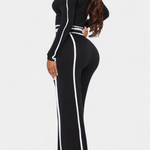 - Lige bukser med kontrastfarvede striber, der visuelt forlänger figuren