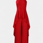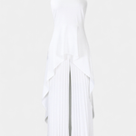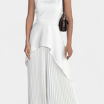 - Silhuet og bevægelse: Brede, plisserede bukser falder let med et luftigt draperingsudtryk, der fuldender topens strukturerede skuldre.