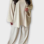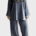 Trine | Langærmet sæt repræsenterer en sofistikeret fortolkning af afslappet elegance, hvor komfort møder nutidig finesse. Dette oversized-sæt giver en let, luftig silhuet og bevægelsesfrihed uden at gå på kompromis med stil. Den langærmede top og de lige bukser udstråler en moderne, afslappet flair, der passer til rejser, hjemmet og et urbant hverdagslook. Fremstillet af bløde, lette materialer, hvis konstruktion afspejler omhyggeligt håndværk og en dedikation til detaljer og lang levetid. Begrænset produktion giver Trine-sættet en tidløs værdi og en ægte samlerappel.