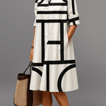 Rosa | Geometrisk kjole er en tidløs erklæring om håndværk og eksklusivitet. Den bløde, naturligt hvide bund giver kontrast til det markante sorte mønster og løfter kjolen til en moderne, sofistikeret æstetik. Udformet med materialer af høj kvalitet og omhyggeligt snit, der sikrer et jævnt fald og en flatterende silhuet. Det arkitektoniske skjorte-kjole-design præsenterer klare linjer og symmetri, der udstråler styrke og femininitet uden prætentiøsitet. Rosa tiltaler designelskere og samlere, og den begrænsede produktion bevarer tidløs værdi og samlerappel. En alsidig form, der passer fra dag til aften og giver lang levetid og vedvarende værdi.