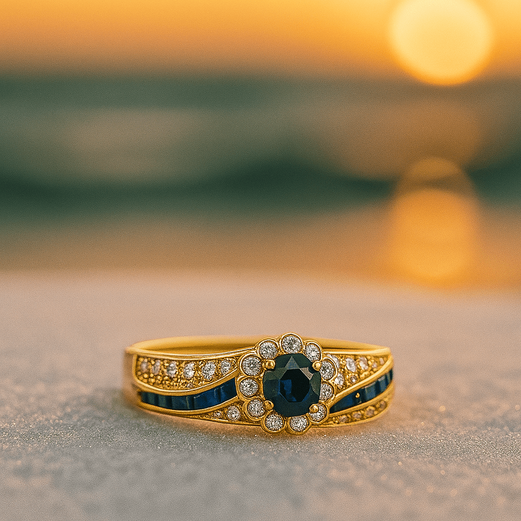 - Centersten: Midnattsblå zirkonia, der reflekterer havets dybder og tilfører dybde.