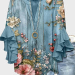 Alberte | Lyseblå bluse udstråler let nordisk elegance og en håndværksmæssig stolthed, der taler til den bevidste garderobe. Den luftige silhuet og det romantiske blomsterprint vidner om materialer af høj kvalitet og omhyggeligt søm. Den afslappede pasform giver daglig komfort uden at gå på kompromis med stil, og den begrænsede kollektion gør denne kreation til en særligt udvalgt investering. Flæsekanter i flere lag på ærmerne tilfører bevægelse og raffinement, mens den tidløse æstetik sikrer lang levetid i garderoben. Syet i et nordisk værksted, hvor tradition møder moderne design.