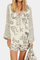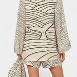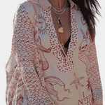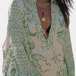 - Løs skjorte med V-hals, snøre og kunstnerisk print tilbyder et sofistikeret statement uden at dominere looket.