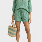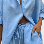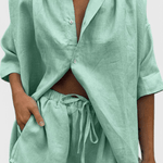 Anika | Sæt udstråler sommerlig, diskret luksus og den tidløse arv af håndværk. Sættet består af en knappet skjorte og lette shorts i en let bomuldsblanding, der sikrer åndbarhed, let vægt og behagelig temperaturstyring i varme måneder. Den strygefri finish gør vedligeholdelsen enkel, mens det justerbare snit sikrer komfort hele dagen. Det minimalistiske design tilpasser sig både lag-på-lag-stil og en ren sommerlook, og materialerne er nøje udvalgte for kvalitet og holdbarhed. Produceret i små partier for at bevare håndværksmæssig betydning og eksklusivitet, tilbyder Anika en tidsløs appel, som kan gå i arv og fuldende en kvalitetsorienteret garderobe.