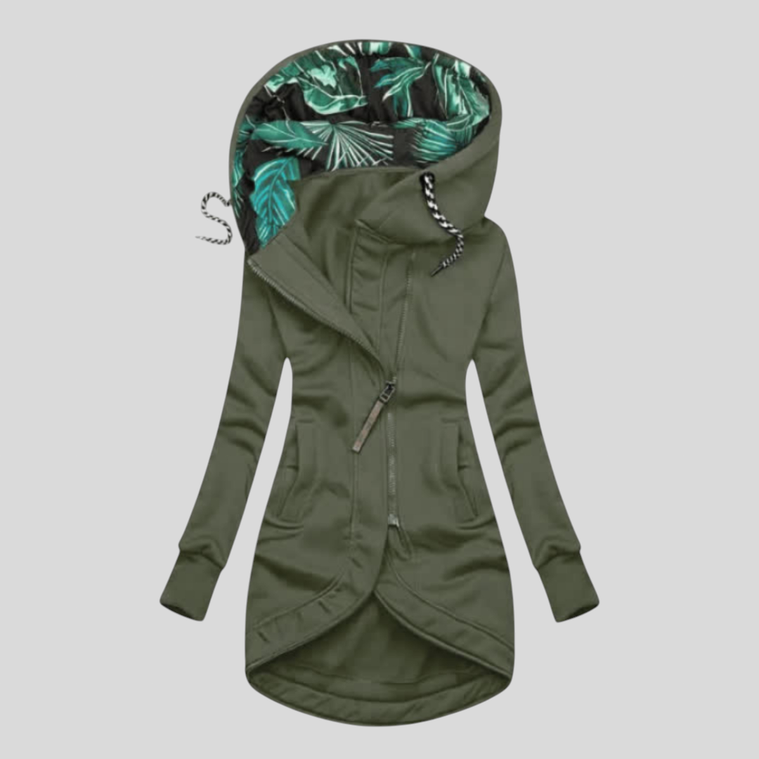 Opfrisk din stil med denne jakke i et moderne snit og med upåklagelig forarbejdning. Det asymmetriske design kombineret med en hætte foret med et tropisk mønster skaber et unikt og autentisk udtryk. Perfekt til dem, der søger komfort, funktionalitet og elegance i hverdagen.