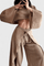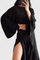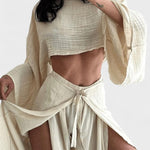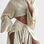 - Design og snit: Let kimono-top med bådudskæring og drapering, samt bindebukser med brede ben og sidesplits for bevægelse og elegance.