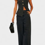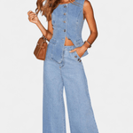 Emma | Denim sæt er en hyldest til tidløs denim, der kombinerer en sofistikeret æstetik med rene, varige detaljer. Den ermelløse vest med knapp-front fremhæver taljen og skaber en slank silhuet, mens de brede, højtsiddende jeans giver komfort og en moderne, afslappet flair. Hver detalje vidner om håndværkets omhu og brugen af kvalitetsdenim i lyse eller sorte vasker, der står tidløst. Sættet udstråler en æstetik af ren luksus og appellerer til dem, der værdsætter kvalitet og en diskret garderobeinvestering. Den velovervejede snit og materialevalg giver en holdbar, elegant pasform, som kan bæres sammen eller separat i mange sæsoner.