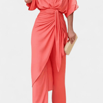 • Det knyttede topstykke med V-udskæring og et justerbart bindebånd fremhæver taljen naturligt.