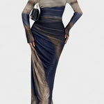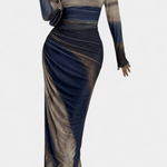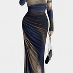 Saga | Maxi kjolen er en hyldest til tidløs elegance og raffineret håndværk. Den kropsnære silhuet følger kroppen med en klassisk rund hals og lange ærmer, mens et let gennemsigtigt lag tilføjer eterisk lethed. Den høj-lav nederdel skaber bevægelse og dybde, så kjolen lever i særlige anledninger og giver en diskret autoritet til enhver garderobe. Designet tiltaler samleren af kvalitetsøjeblikke og står som en investering i en tidsløs æstetik, hvor håndværk og materialer udgør en følgesvend gennem årene.